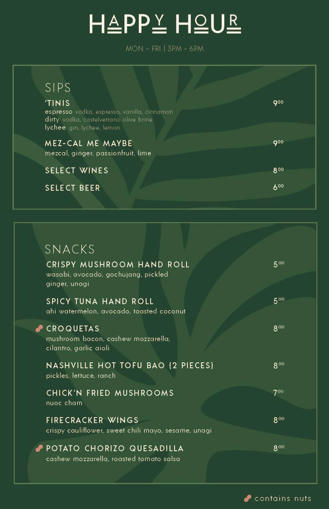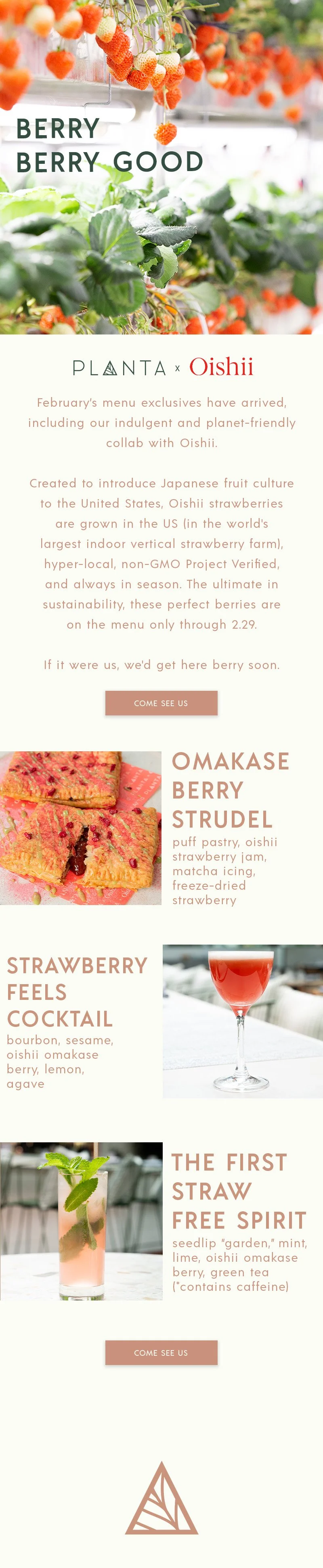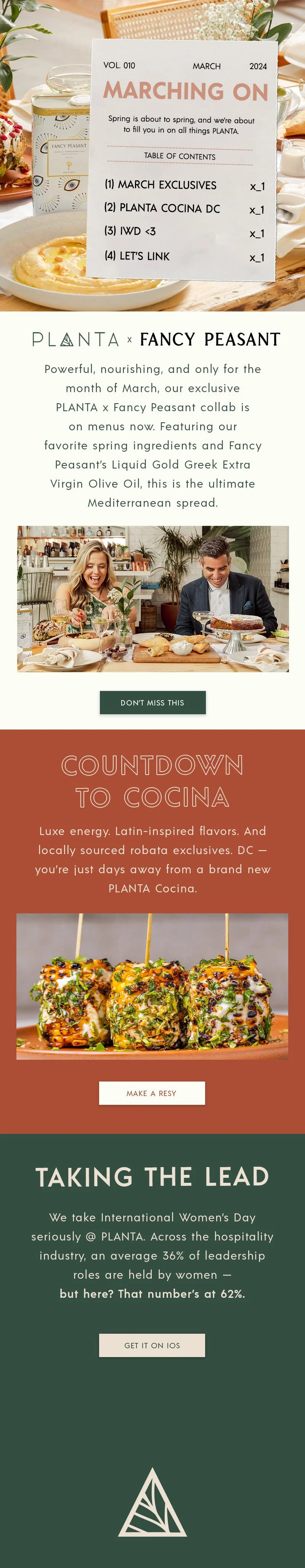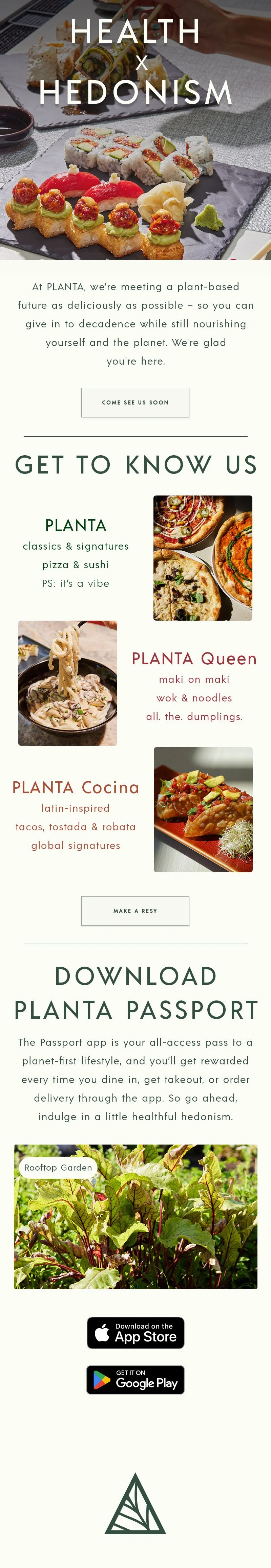 PLANTA Restaurants comprises three distinct concepts: PLANTA, PLANTA QUEEN, and PLANTA Cocina (in order below). We recently embarked on an exciting menu redesign project to breathe new life into each of these unique culinary experiences. Additionally, we've launched Happy Hour at all restaurants, where our goal was to craft a menu that doubles as a